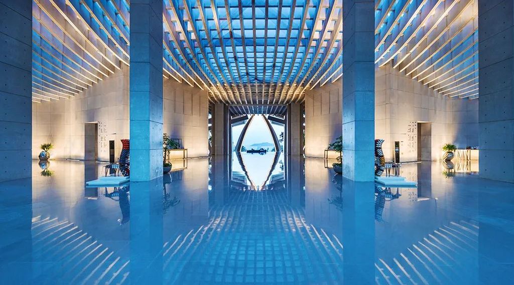 酒店大堂由捷克知名设计师米兰·西派克操刀,随处可见艺术品。光影变换赋予整个大堂流动的鲜活感,让人仿佛踏入了一段艺术的奇幻旅程。