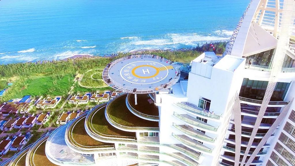 酒店楼顶33层设有空中停机坪,站在停机坪上俯瞰大海浩瀚,对岸美丽的蜈支洲岛烟波浩渺,停机坪也是世界高海景拳台、空中婚礼堂和空中秀场。